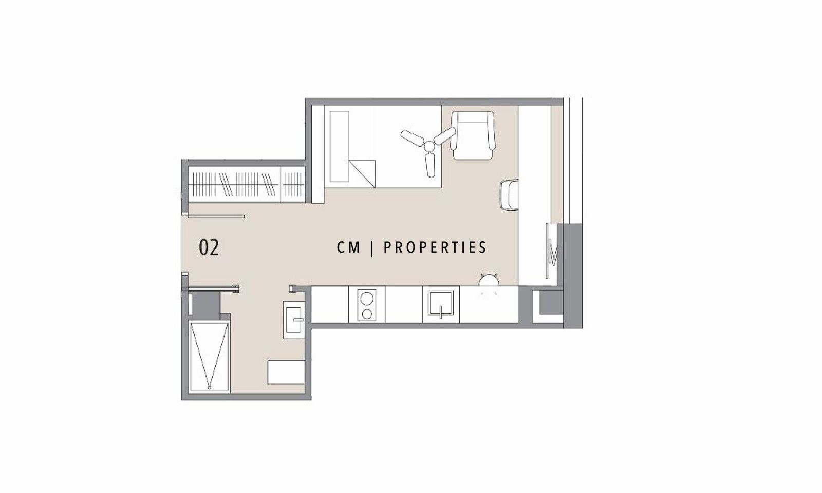 La cocina, de estilo minimalista y totalmente integrada, destaca por su funcionalidad. Equipada con armarios de líneas limpias y una encimera práctica, aprovecha al máximo cada metro. Además, el estudio dispone de un cómodo rincón de trabajo, perfecto para quienes necesitan un entorno tranquilo y ordenado para teletrabajar.