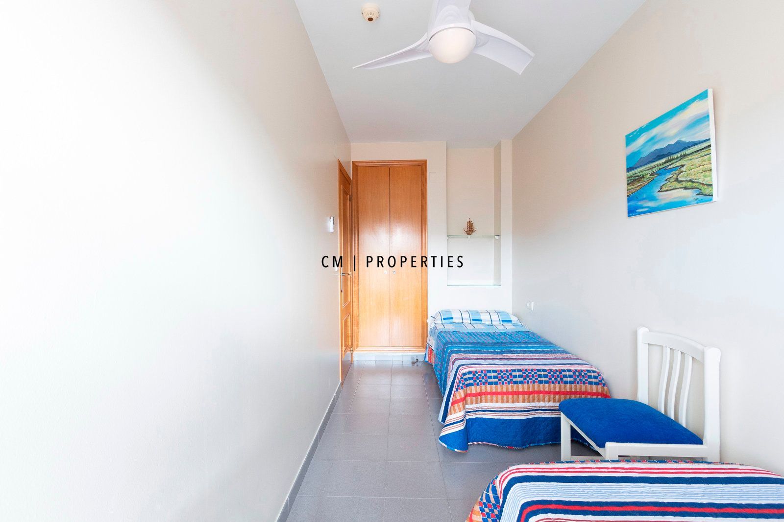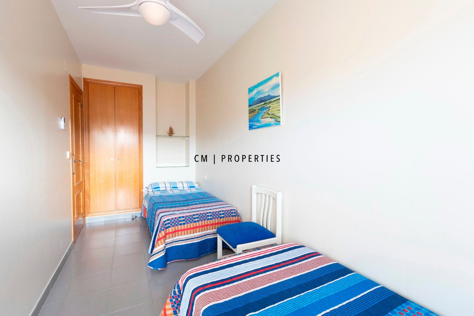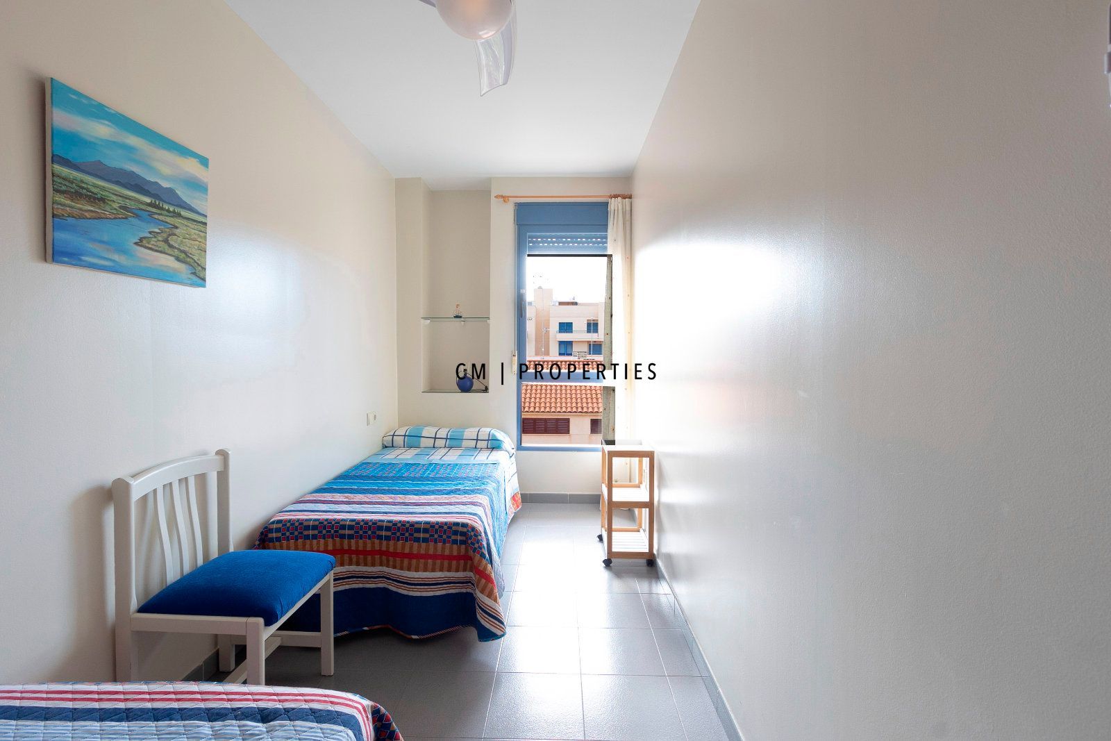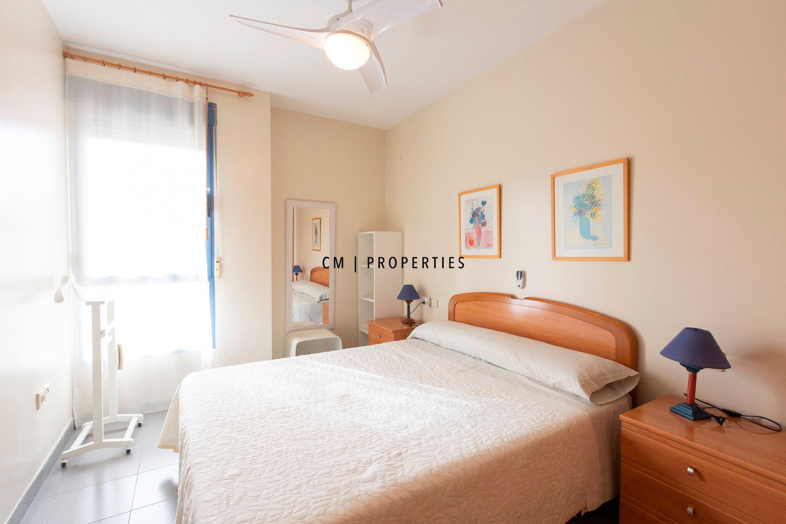 El dormitorio principal cuenta con armario empotrado y ventilador de techo silencioso, mientras que el segundo dormitorio, también con armario empotrado, resulta ideal como dormitorio auxiliar, despacho o espacio polivalente.