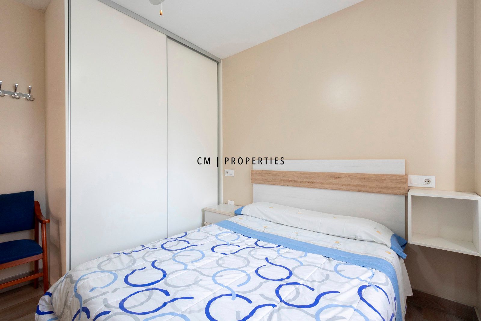 El dormitorio principal es amplio y tranquilo, completamente amueblado, con cama de matrimonio, mesillas y armarios, destacando por su buena iluminación natural.