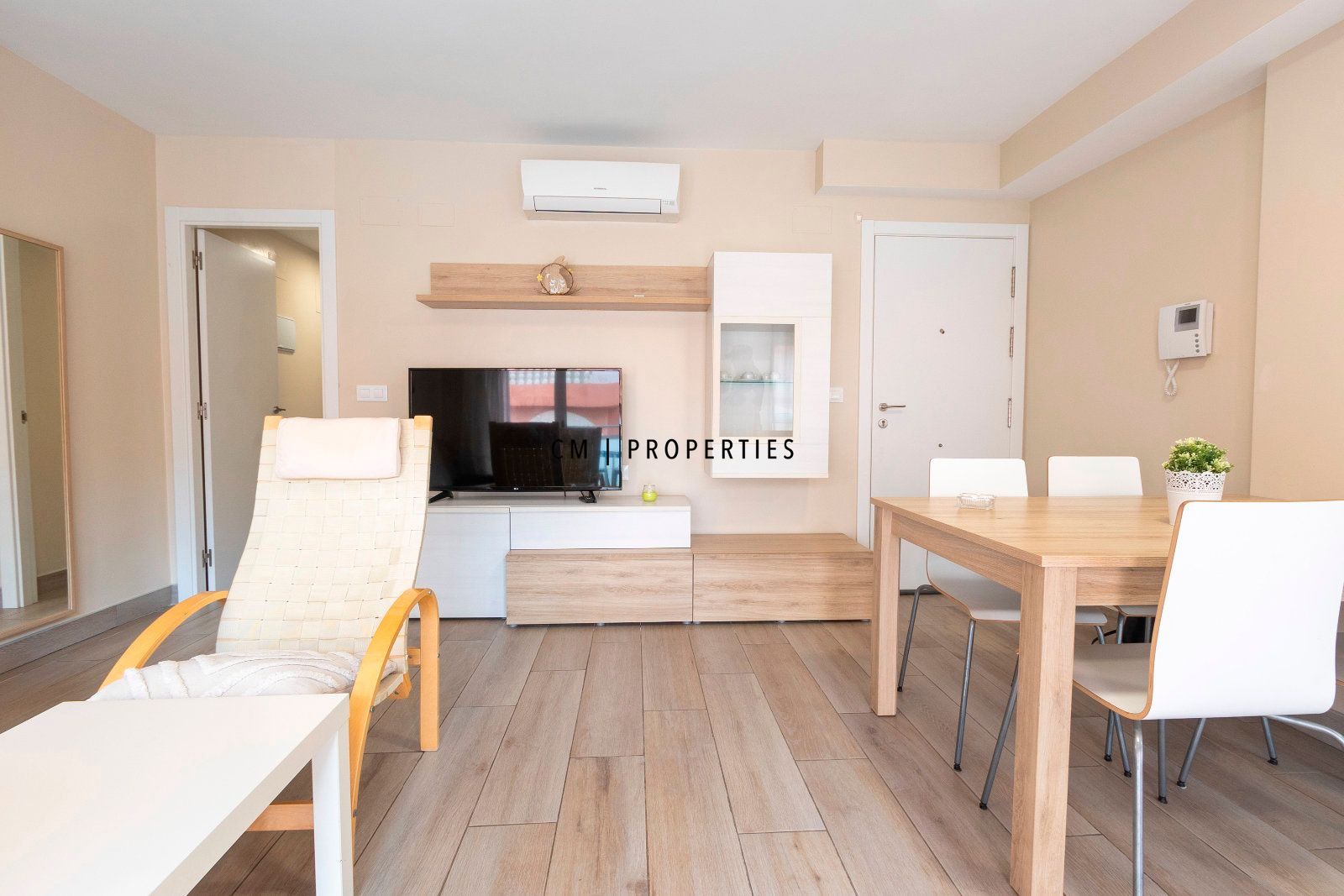 El salón-comedor, muy espacioso y luminoso, está amueblado con sofá, mueble de diseño y televisión, ofreciendo un ambiente moderno y acogedor, ideal tanto para el descanso como para el día a día. Desde el salón se accede a un balcón, que aporta un agradable espacio exterior y mayor entrada de luz natural. Cuenta además con aire acondicionado, garantizando confort durante todo el año.