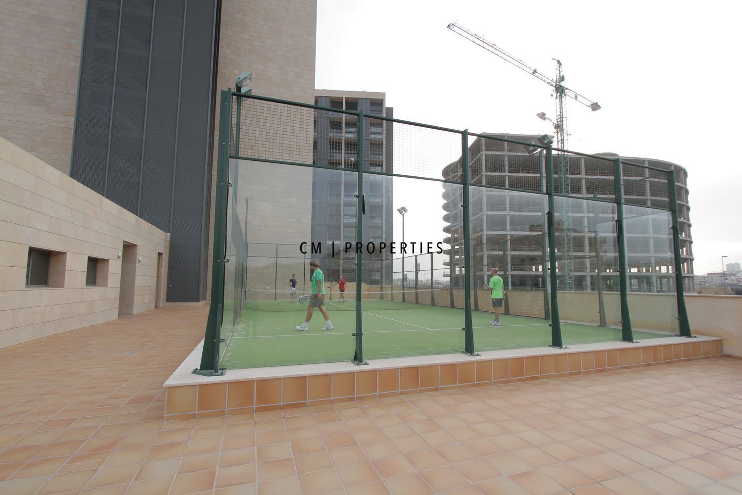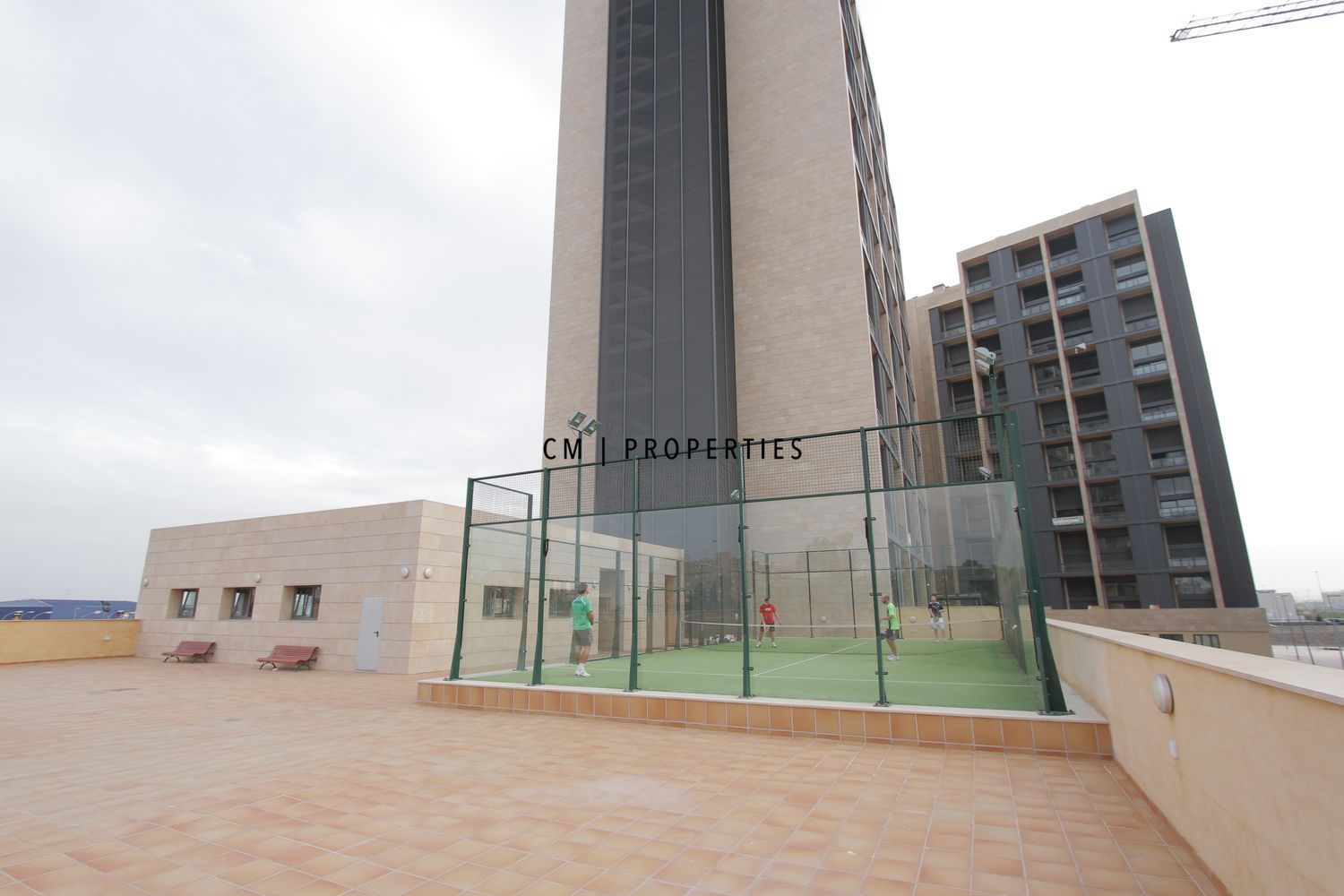 En la misma planta del edificio se encuentran las zonas comunes, que incluyen gimnasio, piscina y pista de pádel. El edificio dispone de conserje 24 horas y servicio de cafetería.