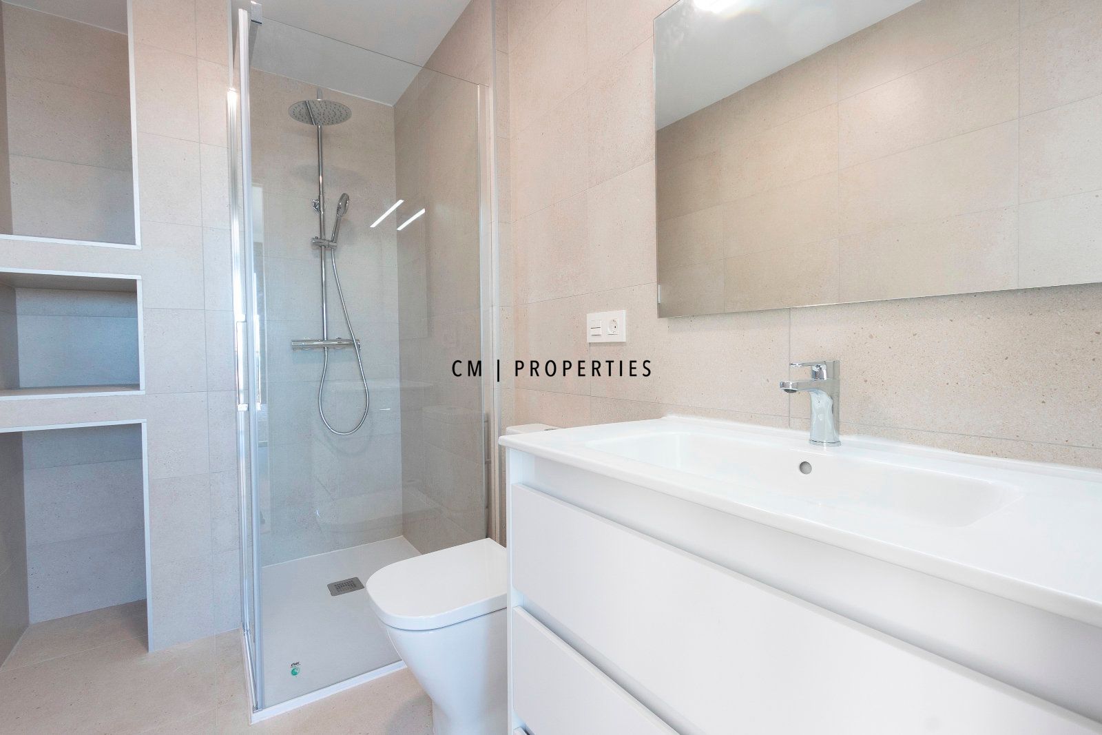 La vivienda cuenta con 130 m² construidos, distribuidos de manera funcional y elegante. Dispone de dos dormitorios con armarios empotrados, destacando el dormitorio principal por su amplitud y su baño en suite con plato de ducha. La propiedad cuenta además con un segundo baño completo con ducha, proporcionando mayor comodidad.