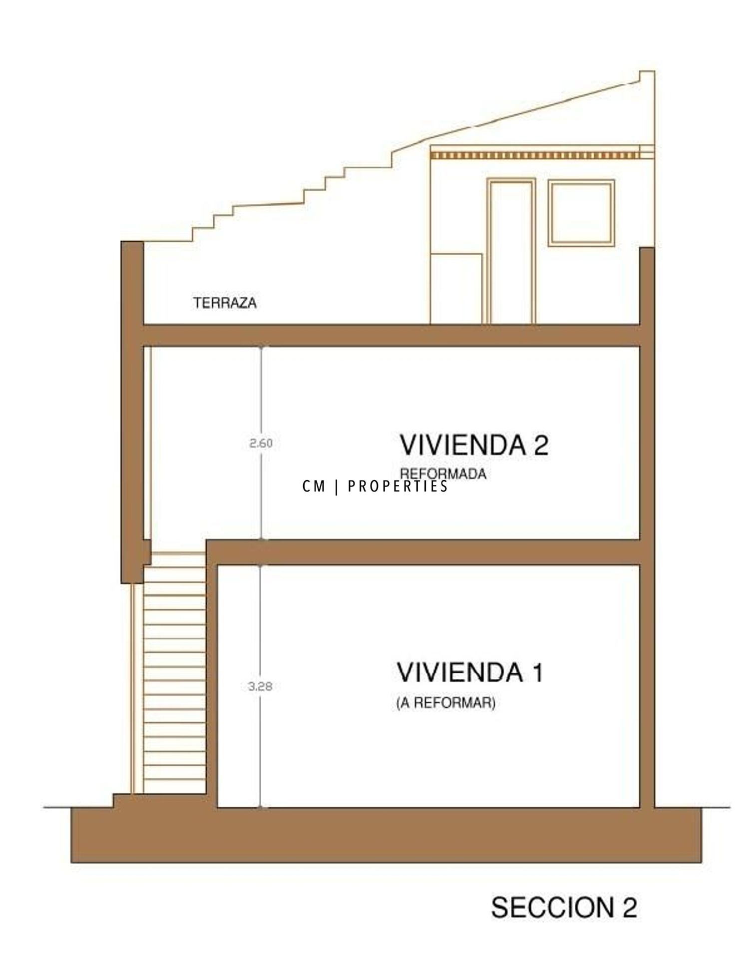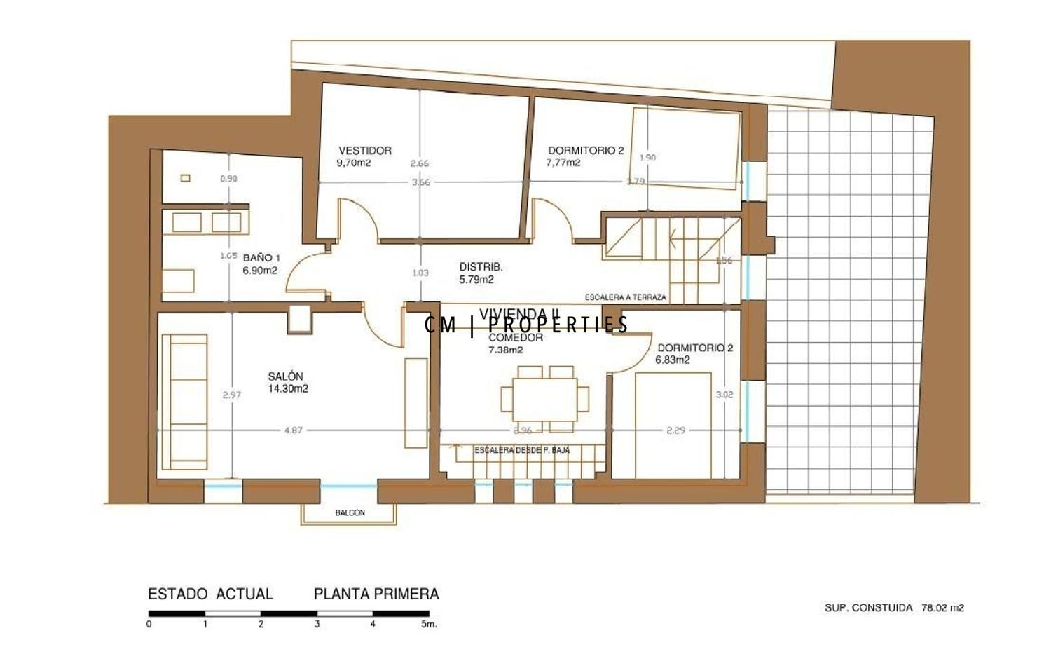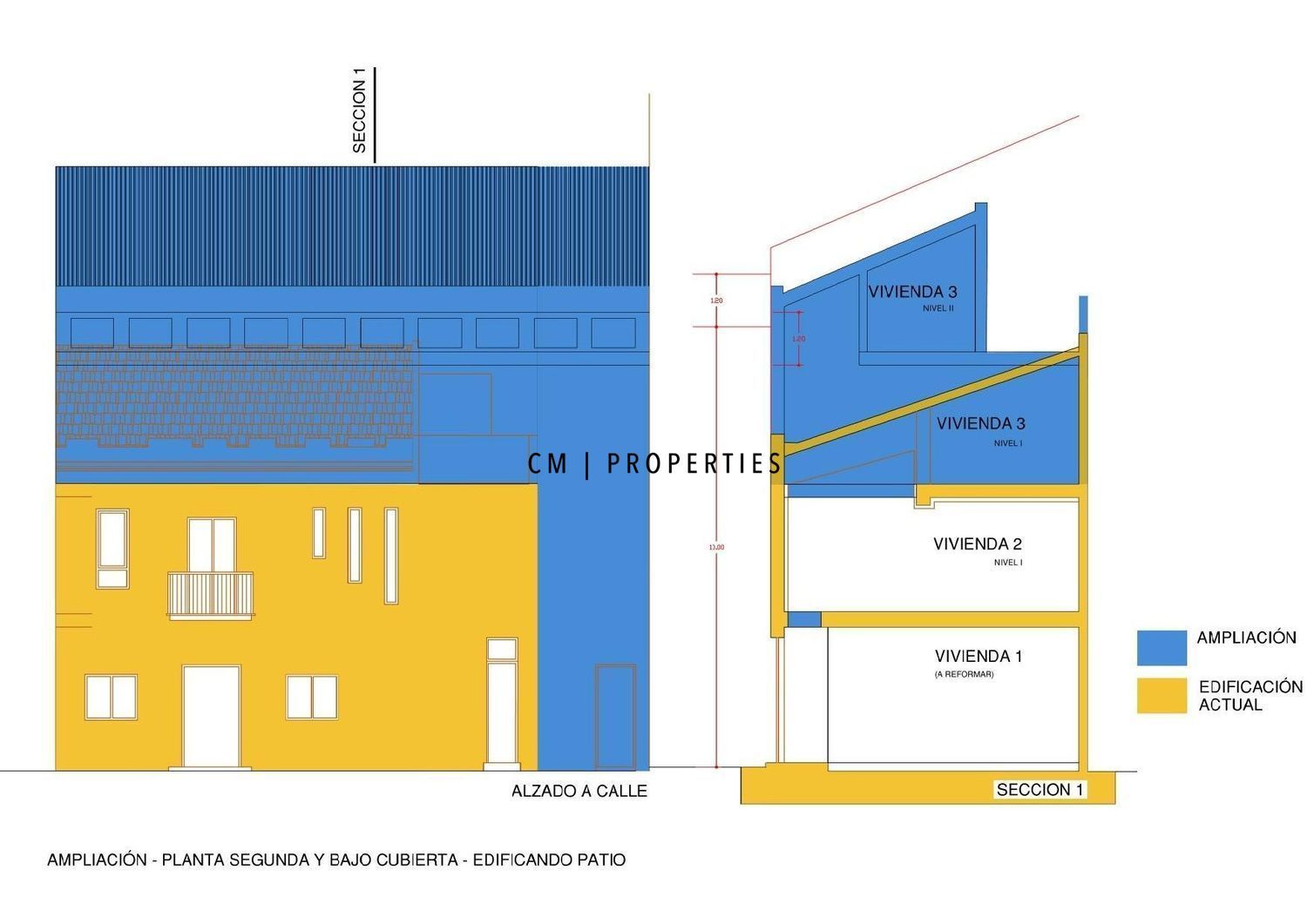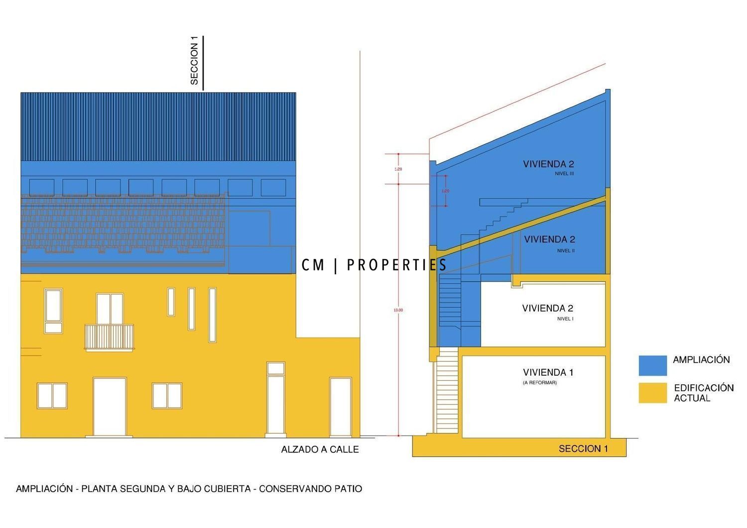 Planta primera: vivienda reformada en 2018, con salón independiente, comedor, cocina, baño completo, dos dormitorios, vestidor y acceso a terraza. Preparada para futura ampliación.